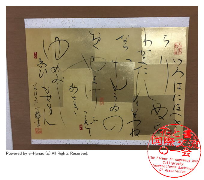 心龍のひらがなの書「いろはうた」の装丁した掛け軸2幅は、漢字作品2幅と並んで金磊美術館に展示されました。金箔の半紙のものと、白の半紙の「いろはうた」です。