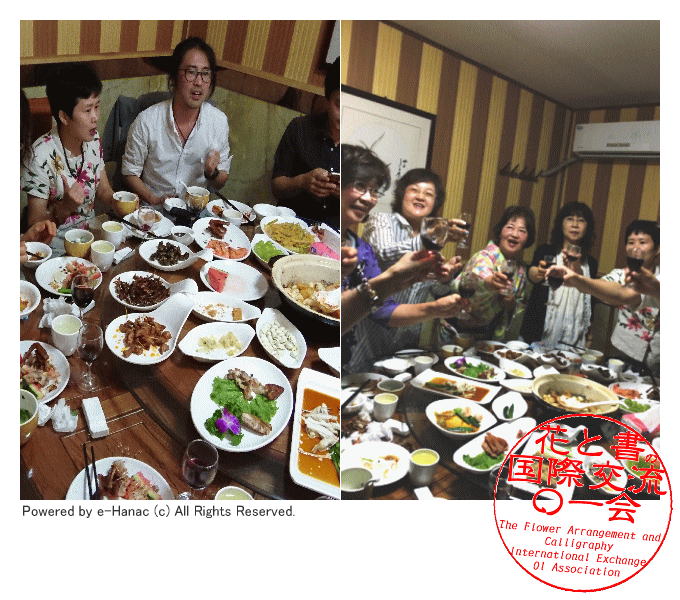 同行の弟子たちは別室で女性書家3人と和気藹々のようです。言葉は通じないですが、中国の皆さん、気を使ってくださり、「さくらさくら」「北国の春」の中国語と日本語のコラボ合唱と盛り上がっていました。中華料理の円卓は、楽しく 賑やかに食事をしやすくするって、本当ですね。